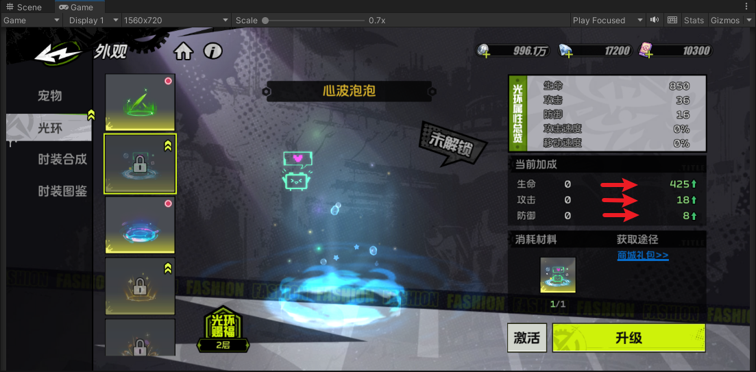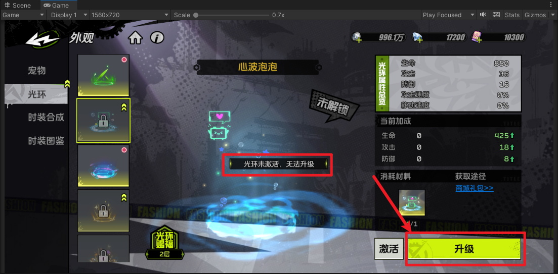 1.光环处于可以激活但未激活状态下,升级按钮置灰