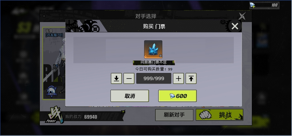 门票不足时,点击挑战按钮,飘字提示【{0}不足】,同时弹出门票购买弹窗